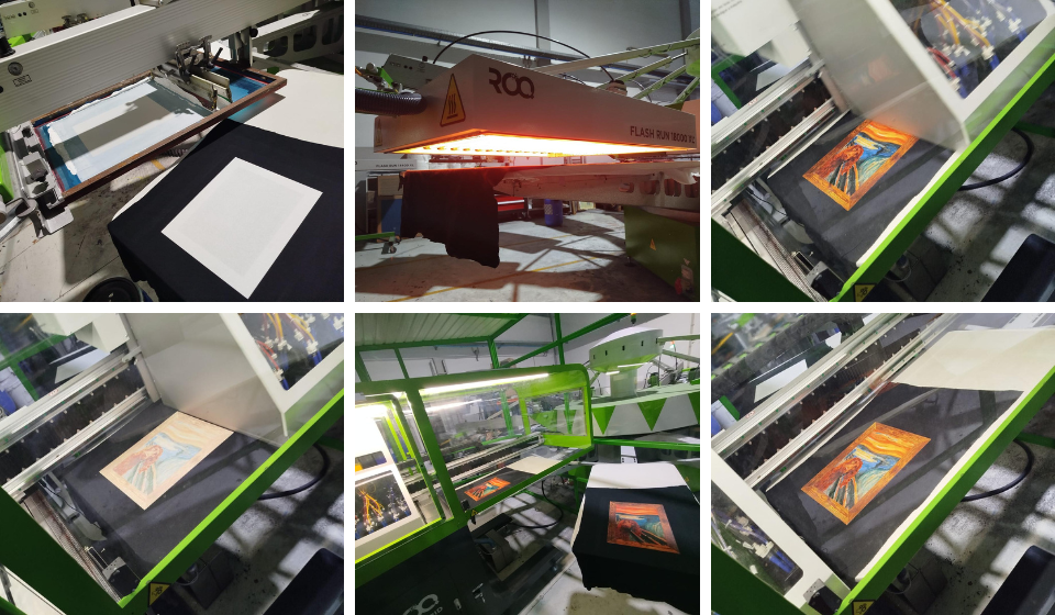 The ROQ Hybrid enables a fusion between screen printing and digital printing, combining DTG technology with traditional screen printing. The efficiency of screen printing allows the management of labor-intensive processes, while digital control facilitates color management, offering a broader color spectrum and resolution options unavailable with traditional printing.